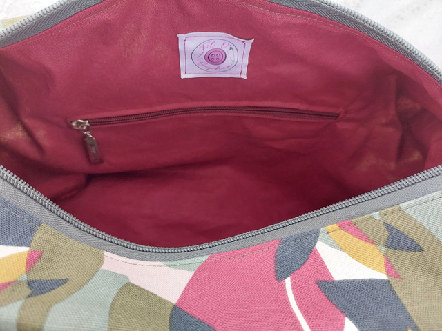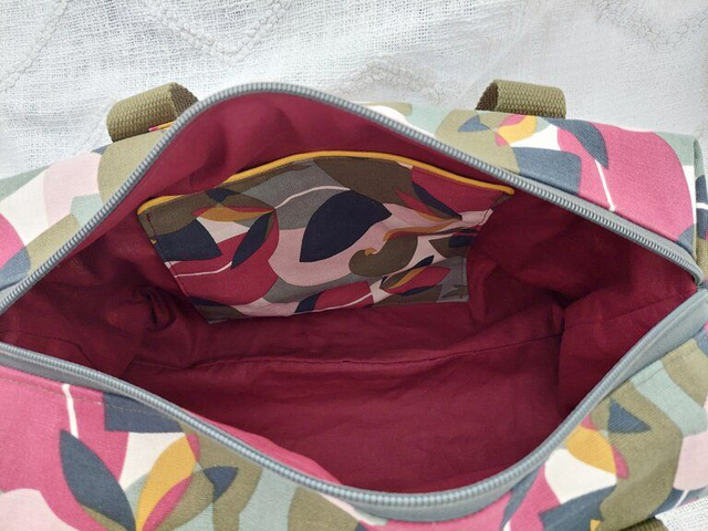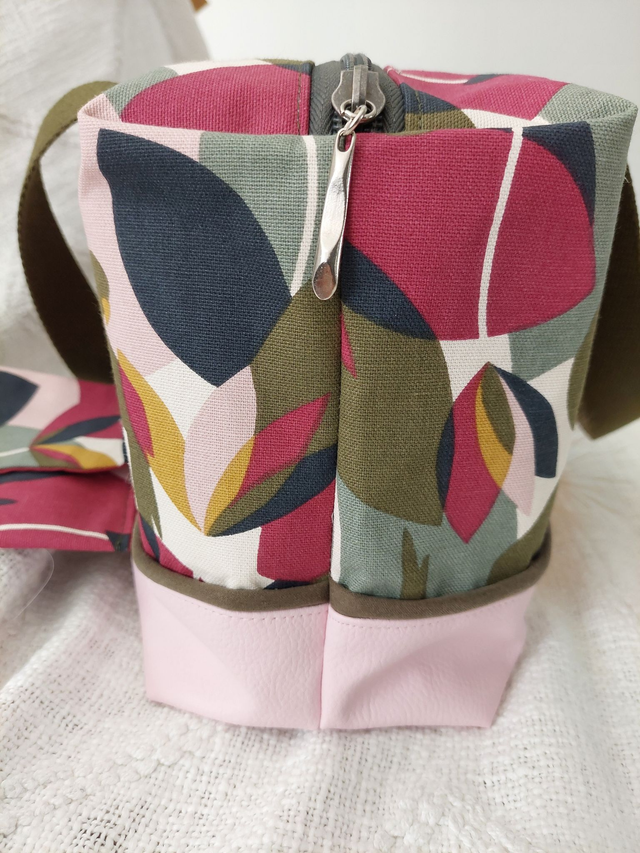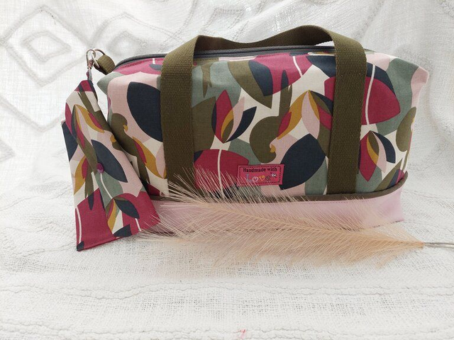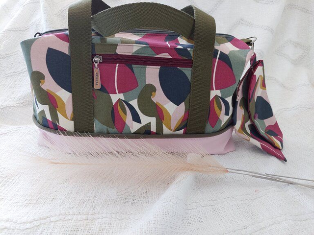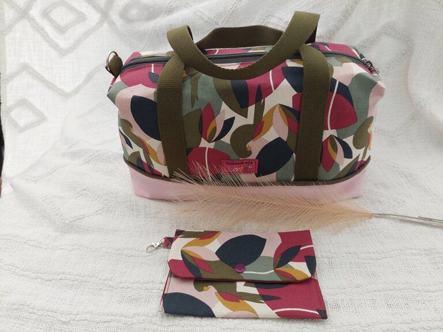 Sac à mains où sac week-end. Dimensions : 35 cm de long 20 cm de haut 12 cm de largeur, en simili rose et tissus coton Perroquet ,1 poche zippée devant de 15 cm ,1 poche zippée dedans de 20 cm et une poche plaquée, fermeture par 1 zippe.